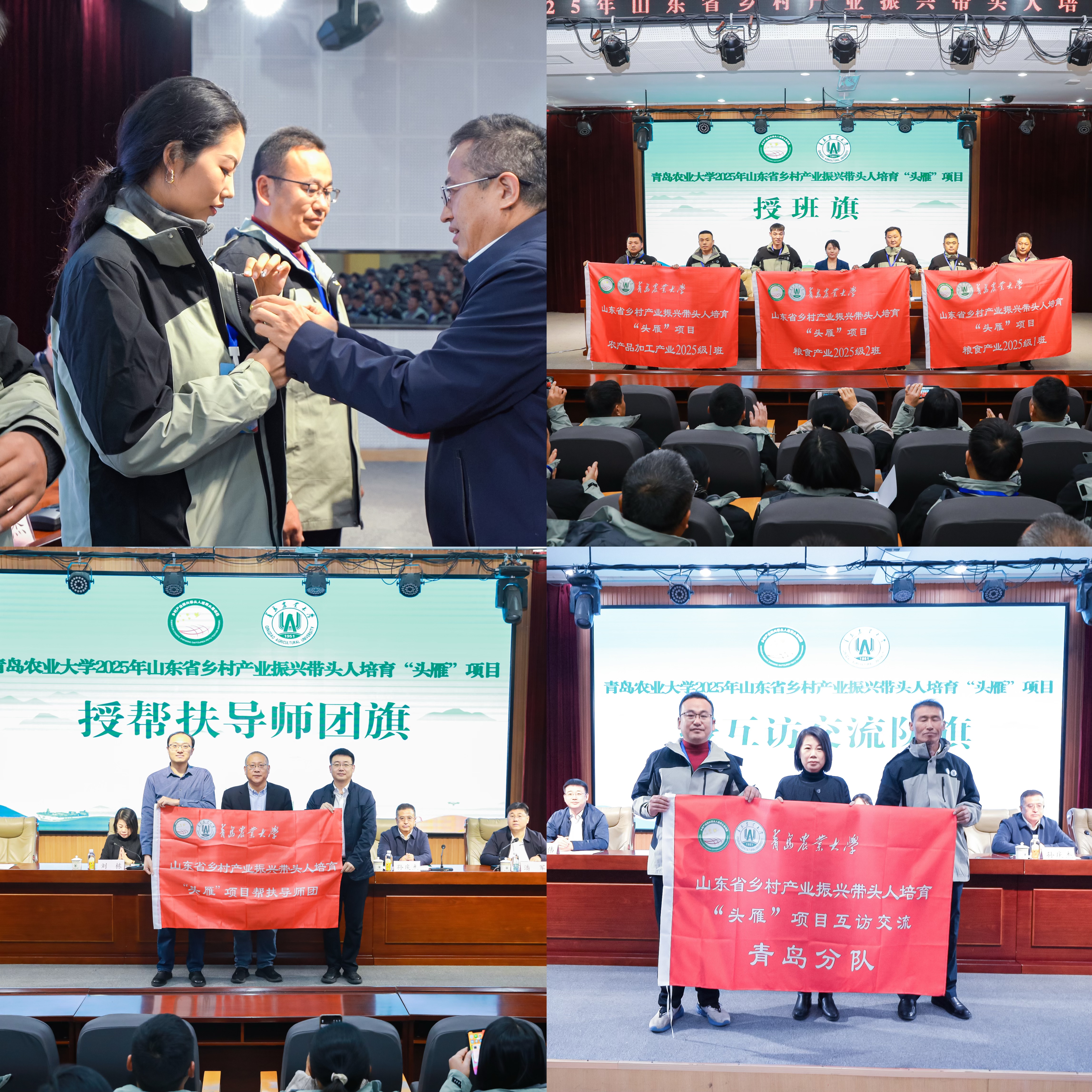 典礼上,孙庆杰为2025年学员佩戴了校徽,丛晓丹为学员授班旗,刘栋为学员授互访交流队旗,郝伟为帮扶导师团授帮扶导师团旗,教师代表,农学院教授石岩和学员代表,山农高标农业(潍坊)有限公司董事长张卓分别发言,典礼由潘军主持。
