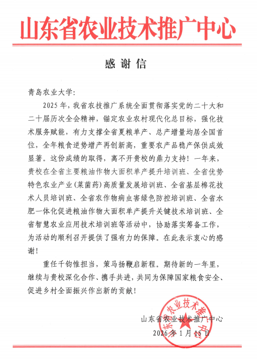 2026年1月15日,山东省农业技术推广中心向我校发来感谢信,对我校在2025年全省基层农技人员培训工作中协助落实筹备工作,为活动的顺利进行提供了强有力的保障表示衷心感谢。信中指出,在全省夏粮单产、总产增量均居全国首位,全年粮食逆势增产再创新高的亮眼成绩背后,凝聚着ylzzcom永利总站在农业人才培养与技术推广领域的辛勤付出与重要贡献。这份沉甸甸的认可,正是对ylzzcom永利总站在过去一年中,高质量承办2025年全省基层农技人员培训项目的最佳肯定。